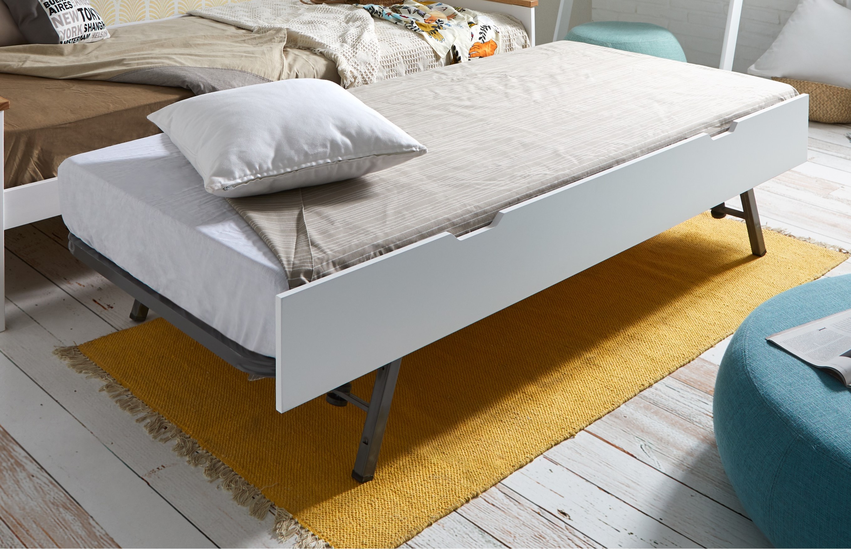 Cajón con somier metálico elevable que se abre en segundos para tener una cama extra cómoda. Frente blanco con uñero, patas abatibles y deslizamiento suave para guardarlo bajo la cama principal. Fabricado en España. Orden, practicidad y buen diseño en un solo gesto.
