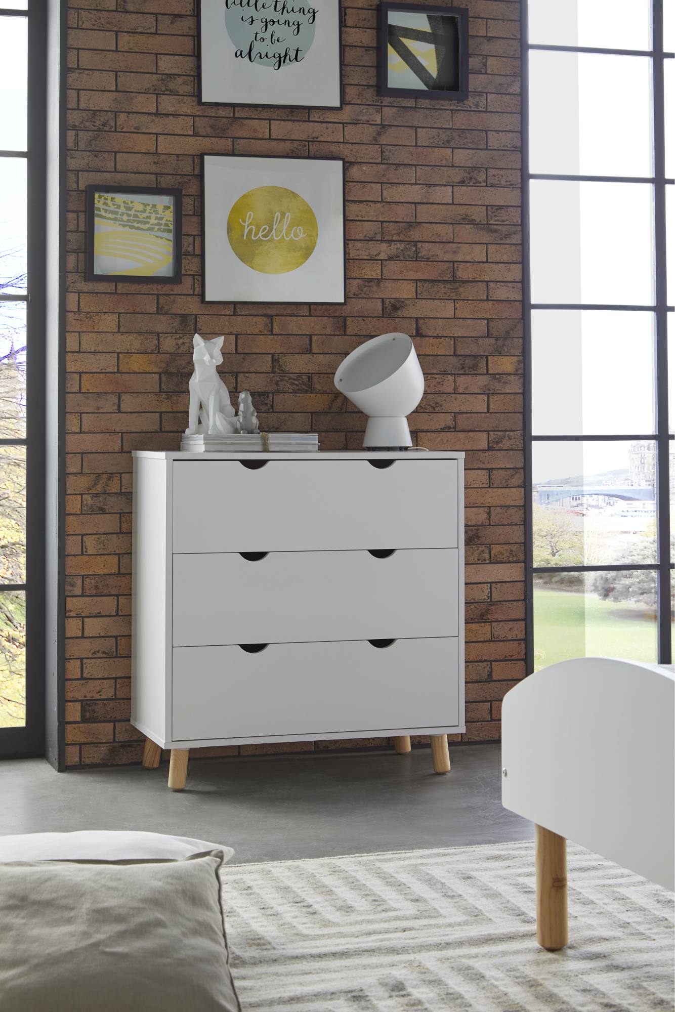 Líneas limpias, blanco mate que combina con todo o azul cielo para iluminar. Patas de madera que dan ese toque cálido. Tres cajones con apertura suave para tenerlo todo a mano. Fabricación española y materiales responsables. Una cómoda serena y práctica que encaja en cuartos infantiles y juveniles.
