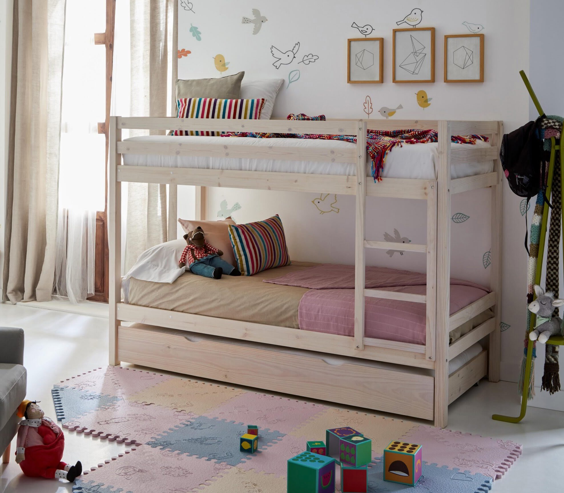 Nuestra litera que despeja el cuarto y multiplica momentos: dos camas firmes, barandillas que abrazan y escalera cómoda. Estable para el trote diario. Fabricada en España en madera maciza. También disponible en varios acabados. Ideal para habitaciones compartidas o para recibir amigos.
